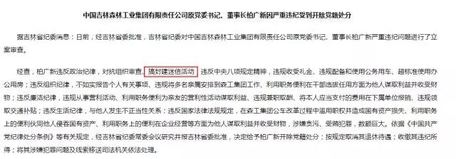 2018年1月5日,在中央纪委监察部网站登出的中国吉林森林工业集团有限责任公司原党委书记、董事长柏广新因严重违纪受到开除党籍处分的通报中,我们发现,柏广新被通报搞封建迷信活动。